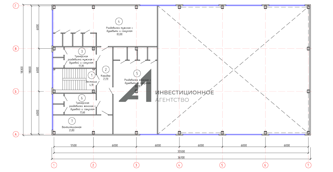 В составе комплекса имеются раздевалки и тренерские комнаты, что делает помещение удобным и функциональным для спортивных клубов, школ и тренерских центров.